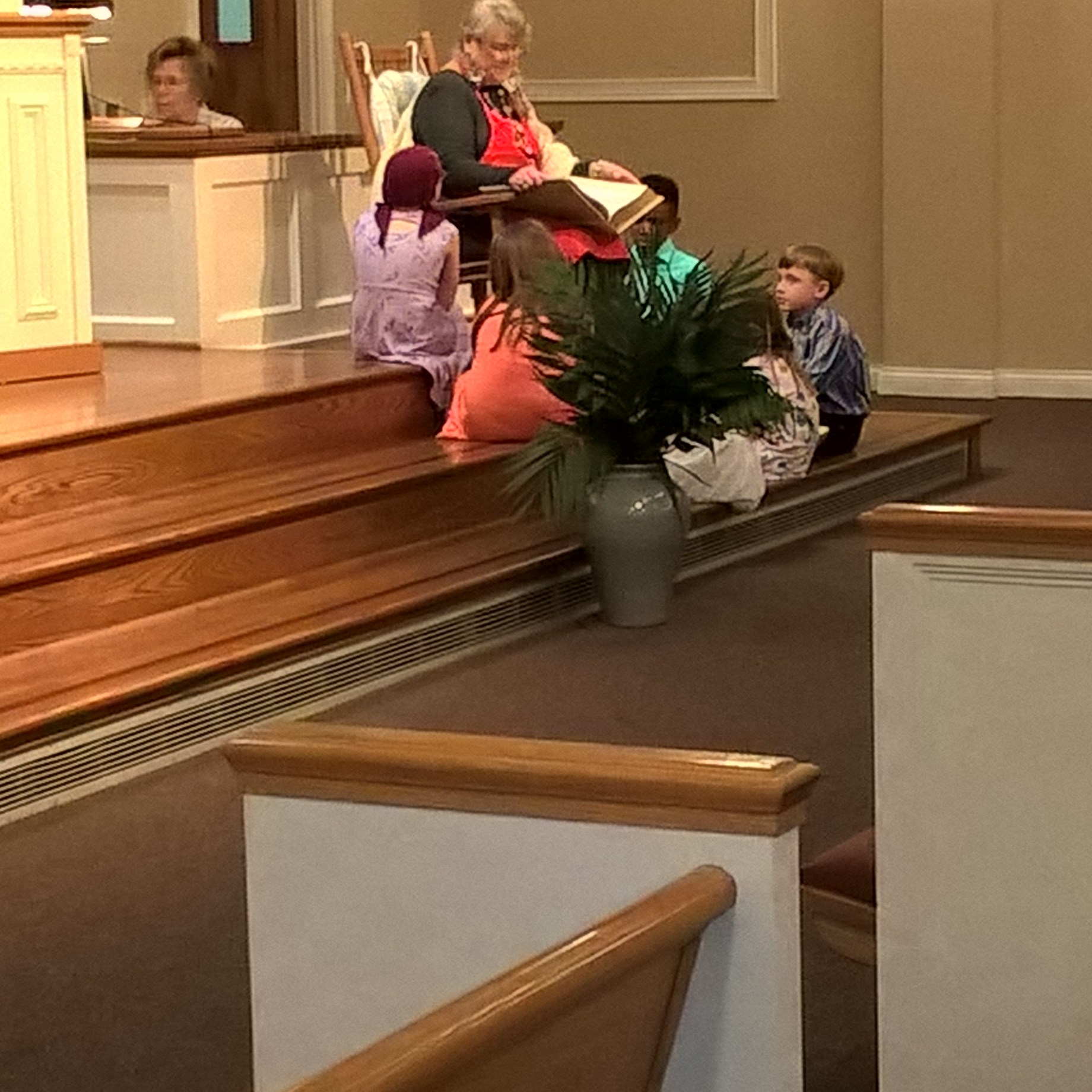 As a song appropriate for either the Easter or Christmas season, the verses are a synopsis of the life of Christ from the cradle to the cross. A mini-drama takes place to the side of the choir loft: a Grandmother with an over-sized Bible and children at her feet mimes the content of each verse. First, Jesus sleeps as “angels raise a great amen,” “shepherds watch their sheep,” and the children ask to hear the story of the first Christmas again.