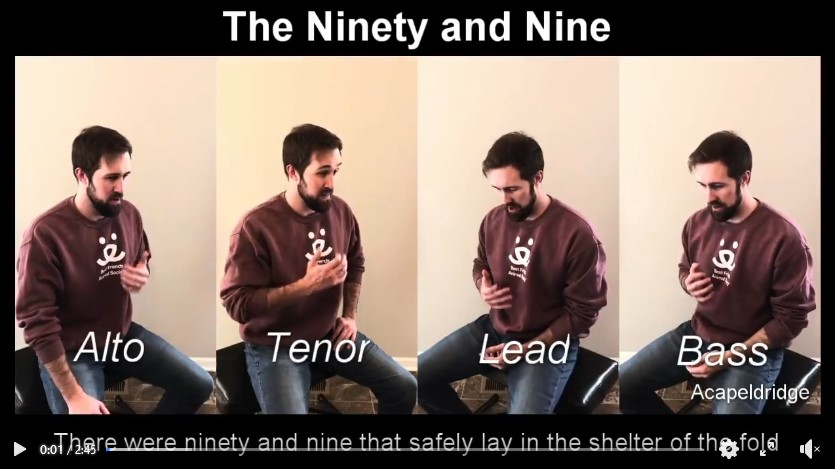 Also, for your enjoyment, I’ve included a link to a November 19, 2019 recording by Michael Eldridge singing a capella four-part harmony in a masterful upbeat rendition of The Ninety and Nine. The video’s subtitles are an aid in appreciating the song’s rich poetry.
