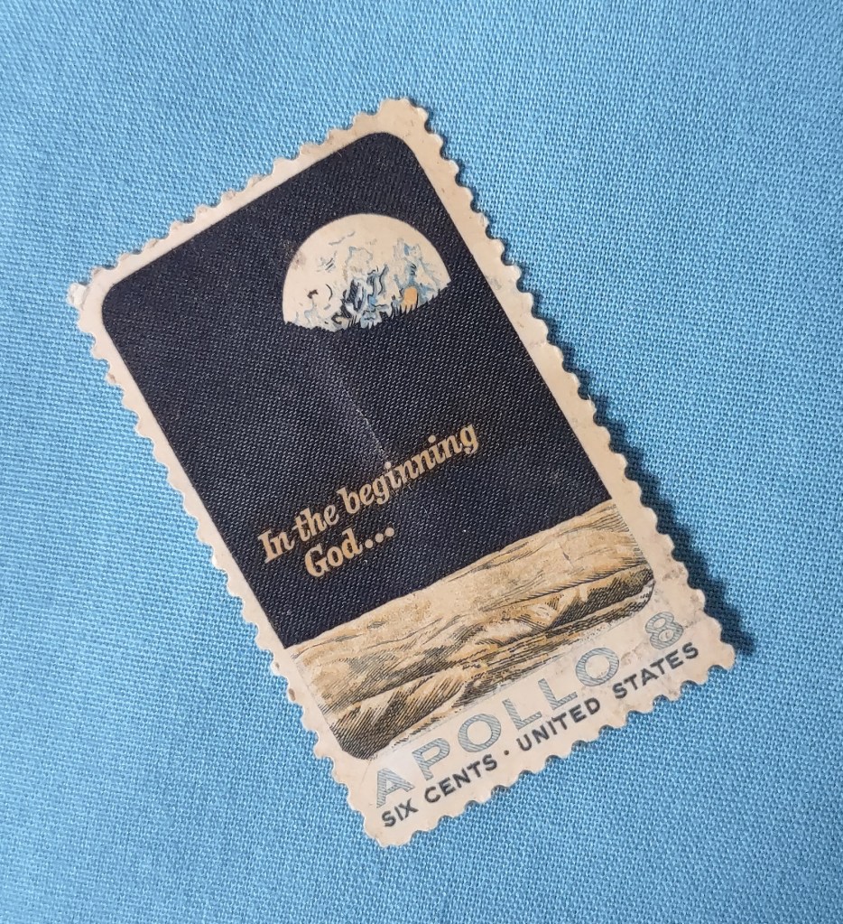 Its image and inscription give clues. It is the photo of the earth as it rises above the lunar horizon photographed by William A. Anders. He was aboard NASA’s Apollo 8, along with his two crewmates, James A. Lovell Jr., and Frank F. Borman. Apollo 8 orbited the moon without landing in December 1968. And Anders’ photo was chosen to be printed soon thereafter in 1969 on a U.S.A. postage stamp with the inscription, “In the beginning God…”