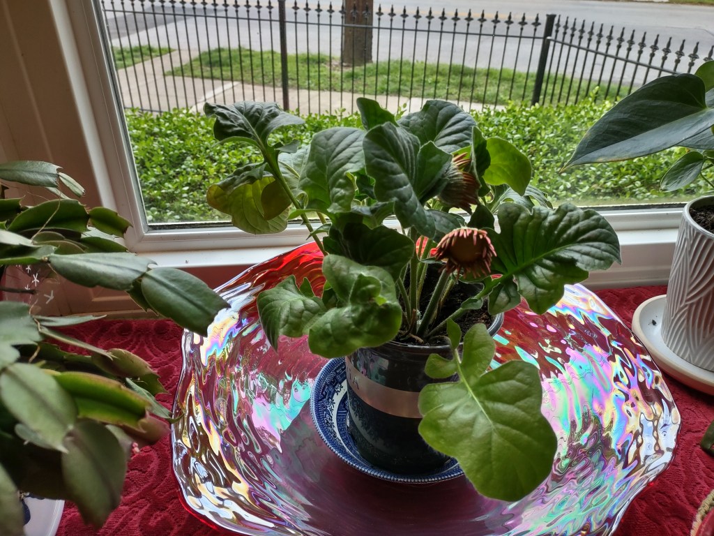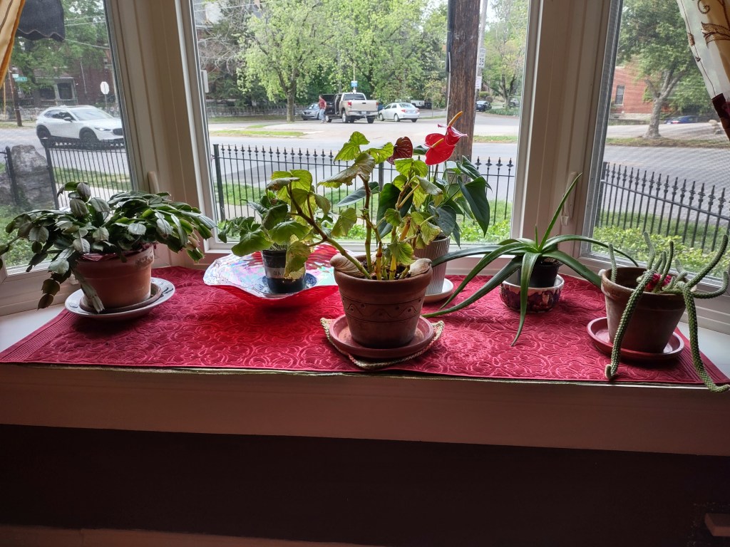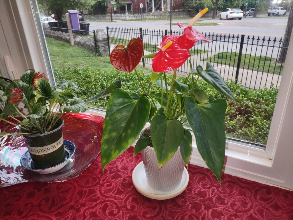 My favorite bay window plant for about the last year is the Red Anthurium, commonly called “Flamingo Lily” with its spectacular crimson heart-shaped blooms. Its care instructions, which came with it, say to just add six ice cubes on top of the soil once a week. That’s what I’ve been doing ever since it was given to me, and it continually looks fabulous! Maybe you’ve noticed: I do love red!