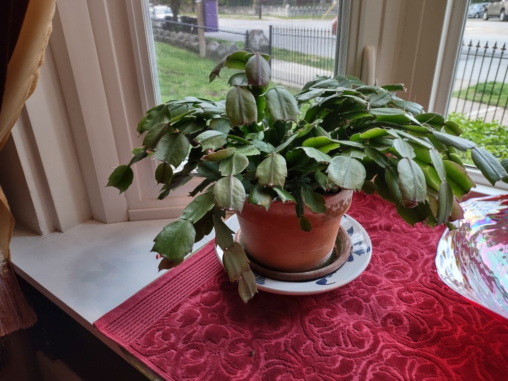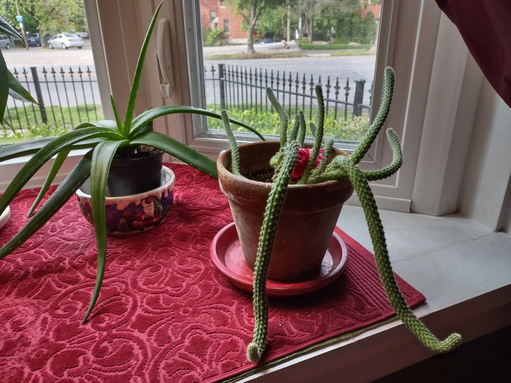 I allow the soil in the Christmas Cactus pot and a nameless-to-me cactus pot to dry out completely between waterings. That cactus with the long tentacles started out in a tiny plastic pot, so you can see that I repotted it as it grew. As I don’t remember its name, I’m calling it “nameless-to-me.”