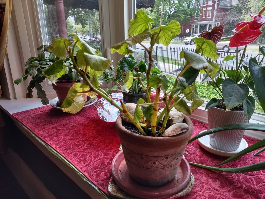 There is one plant which does not look like a success story right now. It is a bedraggled Begonia which suffered from transplantation shock. It had beautiful pink blooms when it was given to me. It was getting very tall so about a month ago I cut it back severely. I also thought it needed a potting soil in place of the clay soil it was in, so I switched that out. I may have been wrong on both counts. But I’m hoping she will come back to her once-beautiful self!